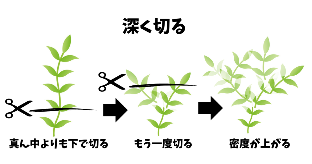 始めに先端だけ切ってしまうと、枝分かれするところが少なく、密度が薄くなってしまうので注意が必要です。
