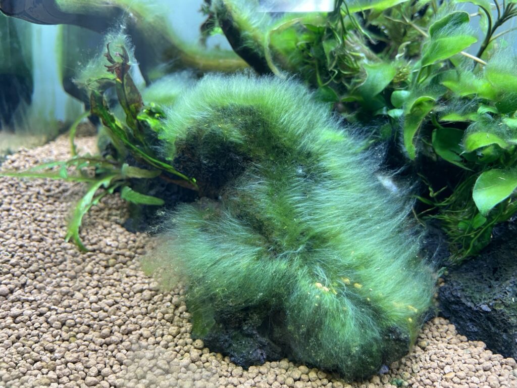例えば、こちらをご覧ください。石や水草にびっしりコケが生えてしまっています。