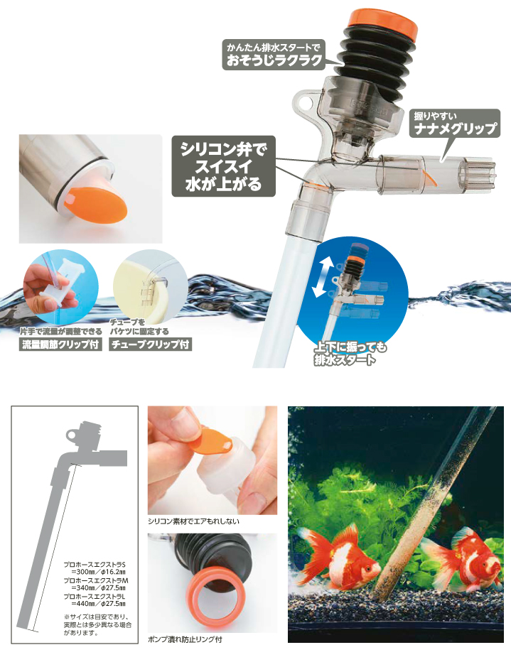 GEXのプロホースは、ちょうどよい水の流れを作り出し、ソイルや砂利の中の汚れだけを吸い出す構造になっています。
