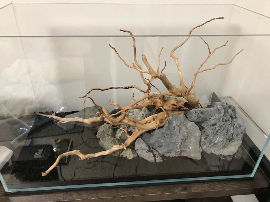 今回は流木などを置いた回りにソイルを入れていきました。