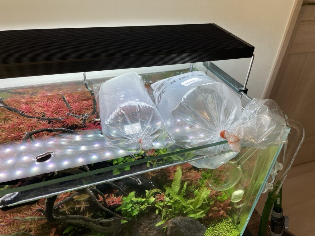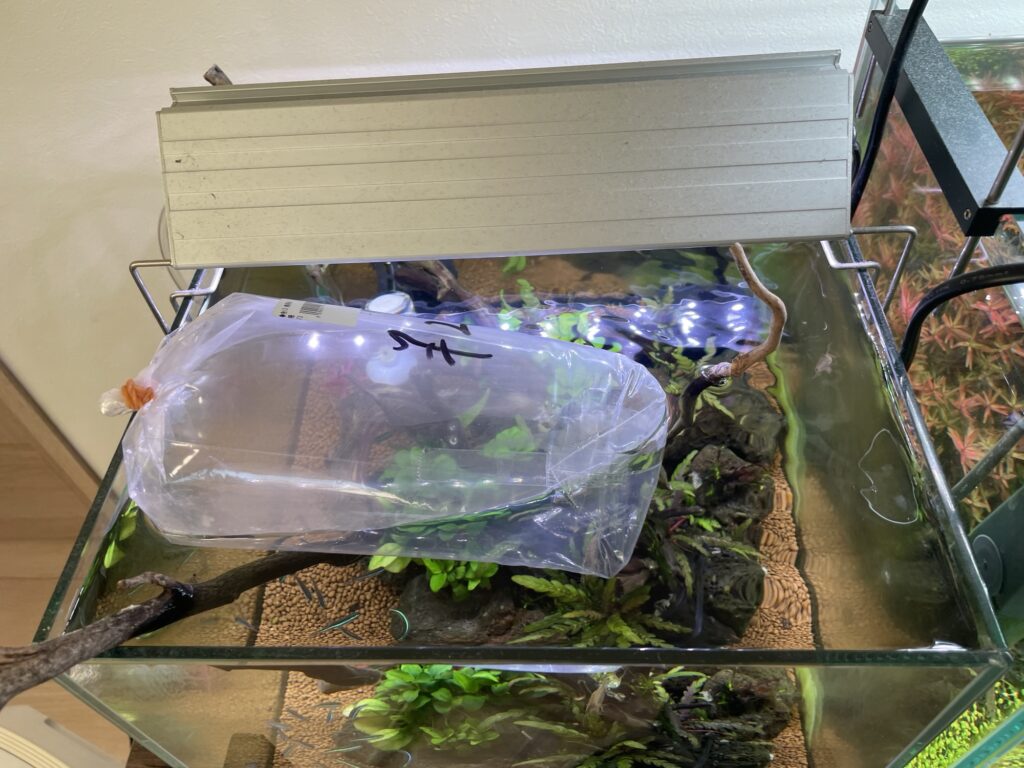 熱帯魚やエビはだいぶ水に慣れてきたころなので、袋の水ごと水槽の中に出してあげます。