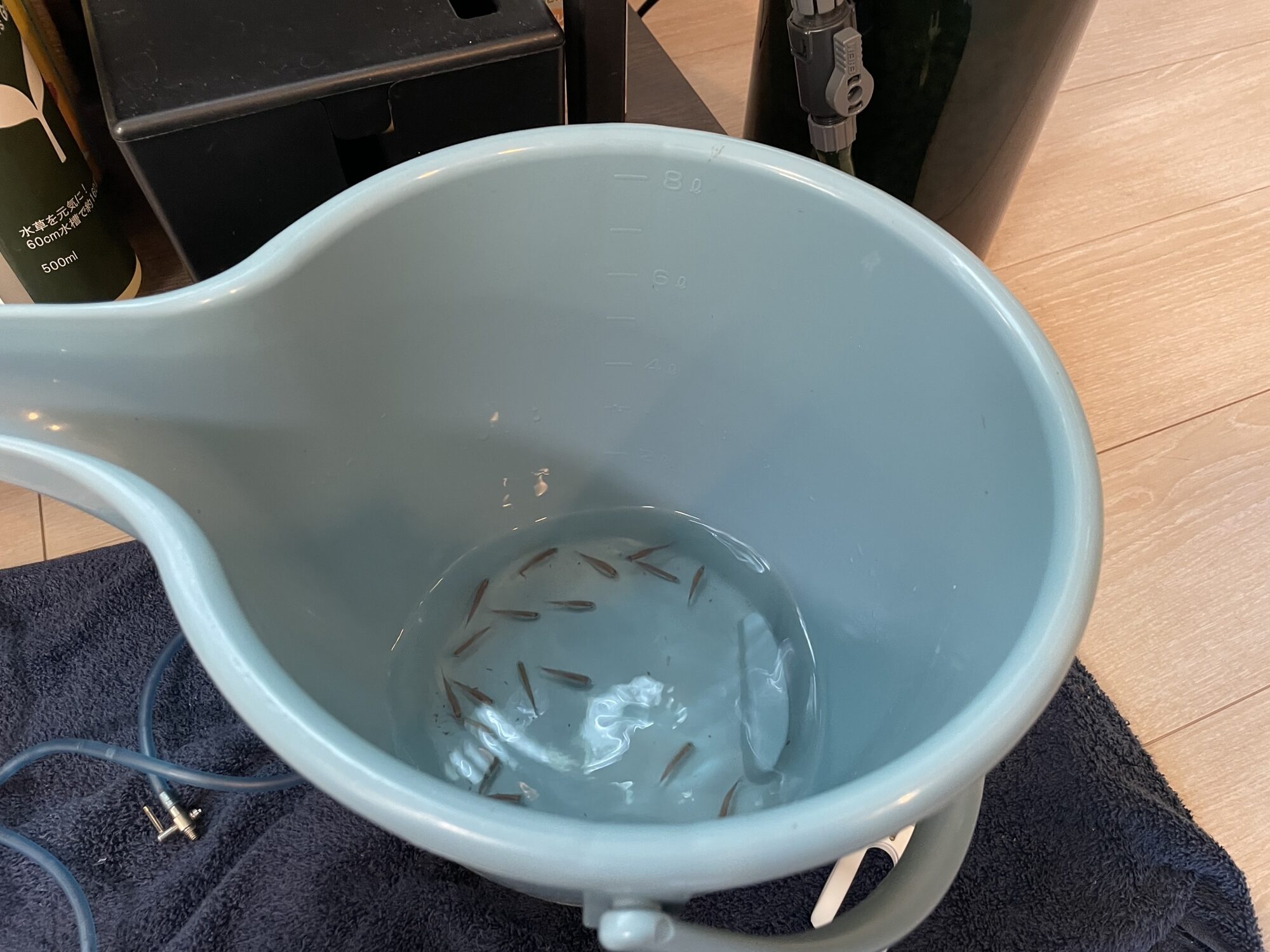 3分の1くらいの水が変わっただけでも、熱帯魚やエビとしてはかなりのストレスがかかっています。そのため、ここでは慌てずに15~20分程度待ちましょう。